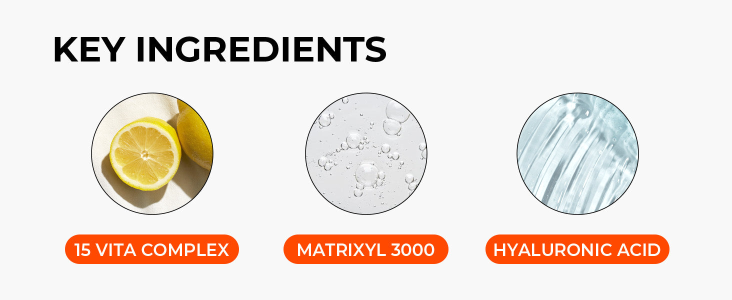 15% Complexo de Energia Vita: Formulado com uma mistura de 15 vitaminas, Colágeno Hidrolisado e MATRIXYL 3000, esses ingredientes restauram a umidade essencial da sua pele e melhoram sua firmeza.