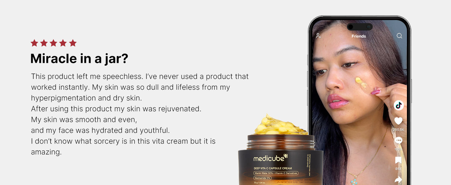 Love all of the Medicube products especially this vitamin C! Leaves a beautiful glow, and I don’t usually wear makeup! I now go makeup free since using medicube products ! My skin feels amazing and doesn’t irritate my skin at all! So easy to use just a little capsule glows up my 54 year old skin! Very effective and the value is amazing it’s so affordable! A must have!
