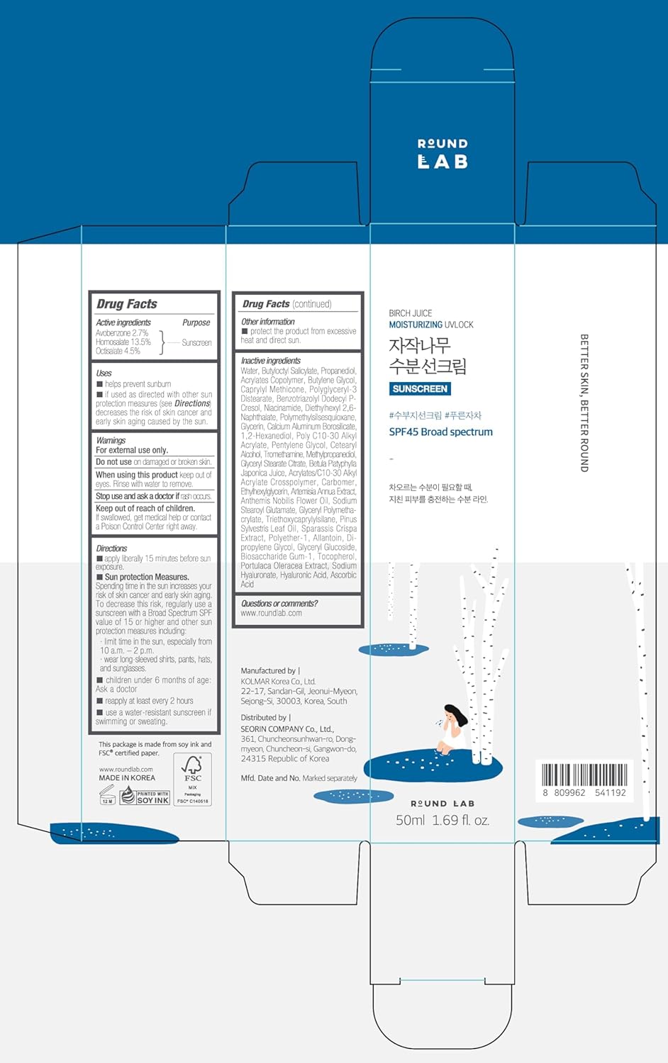 ROUND LAB Protetor Solar Hidratante Birch Juice UV LOCK FPS 45 Proteção UV de Amplo Espectro – Leve, Livre de Óleo, Orgânico, Não Tóxico, Seguro para Recifes, Essencial para Viagem, Cuidados com a Pele Coreanos (50 ml)